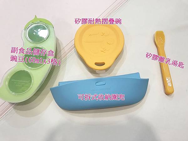 關於副食品器具的部份,因為要耐高溫,所以後來挑到奇哥這一組【PUP副食品哺育禮盒】一方面也是因為輕巧好收納,外出旅行攜帶方便,而且採用安全無毒的柔軟矽膠,不含塑化劑、雙酚A,所以能安心為寶貝準備副食品,這一組裡面有可拆式收納圍兜/副食品儲存盒-豌豆(60mlx3格)/矽膠耐熱摺疊碗/矽膠離乳湯匙。