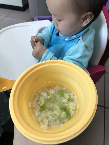 女兒現在很愛自己拿食物吃~我就讓她碗裝好食物,讓她自己探索,感受一下食物的觸感!