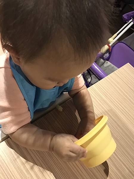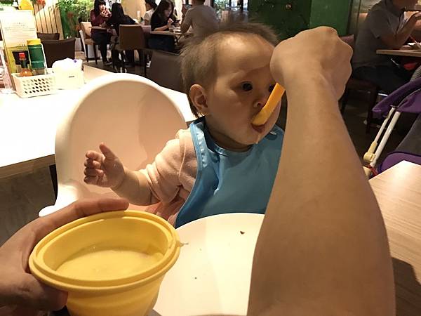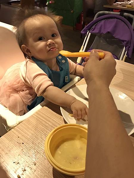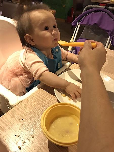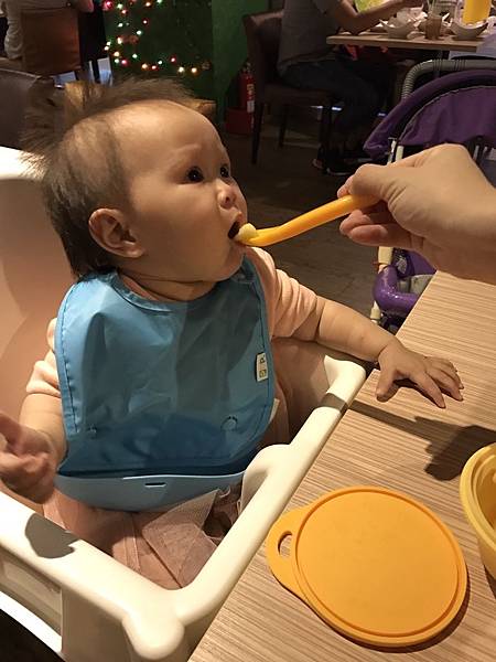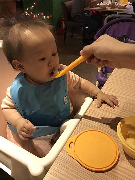 女兒身上帶的就是圍兜兜,兩段式可拆式收納圍兜,很好清洗,重點是重量不重滿輕巧的,女兒如果沒吃進去食物也會直接掉在矽膠口袋裡,還滿方便的!矽膠離乳湯匙,加長型手柄所以很好餵,湯匙很柔軟,所以如果力道沒掌握好,用到寶寶牙齒也不會傷牙齒,外出用餐時我們還是會拿湯匙餵他~結果對蘋果不感興趣,比較想喝玉米濃湯~哈哈